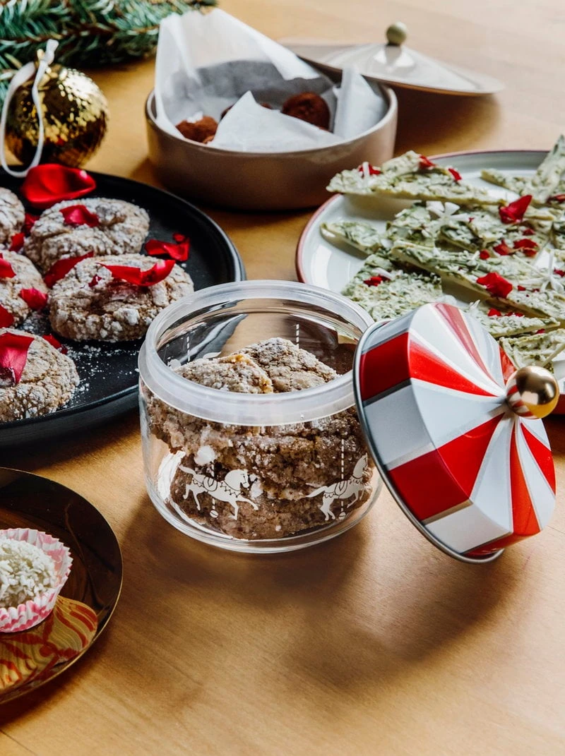 Alessi’s Circus glass jars are decorated with white carousel horses. The red and white tinplate lid features a sealing ring and a golden knob. The canisters are available in different sizes.