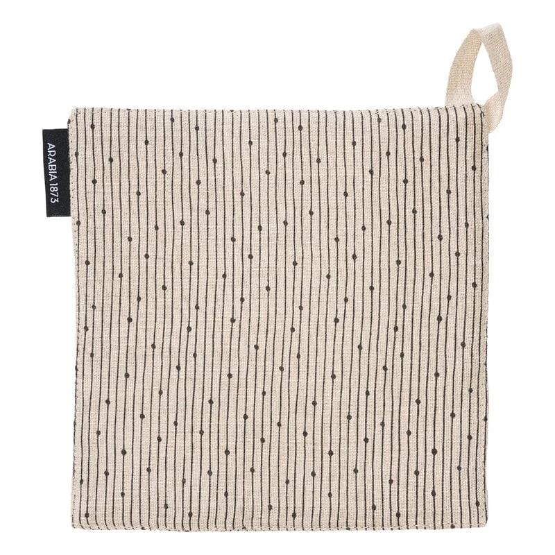 Arabia’s Mainio Sarastus potholder gives kitchens and cooking activities a touch of timeless Finnish design with a contemporary spirit. Symbolizing the power of light, the Sarastus (”dawn”) pattern was inspired by Raija Uosikkinen’s Ivalo decoration from 1965, with its rhythmic lines arranging into a new, fresh shape for the Mainio Sarastus collection. The padded potholder is made of 100% linen.