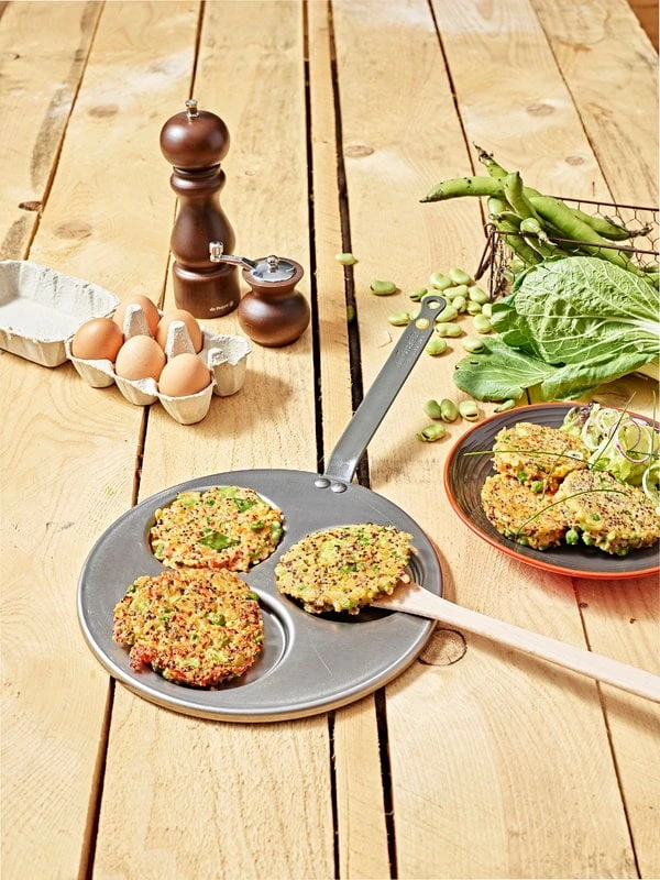 The Mineral B pan is coated with natural beeswax that protects it from corrosion and enhances its non-stick properties. When used regularly, the pan will turn darker and develop a natural non-stick surface – the blacker it gets, the less it sticks. The ladle and spatula are also finished with a natural beeswax coating.