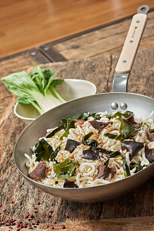The robust and lightweight carbon steel pans can withstand high temperatures, are excellent for caramelizing food, and stay hot for long. When used regularly, the pan will turn darker and develop a natural non-stick surface – the blacker it gets, the less it sticks. You can also season the pan every now and then. Mineral B Bois pans have been manufactured in France.