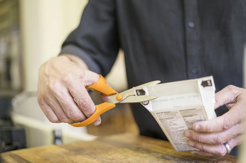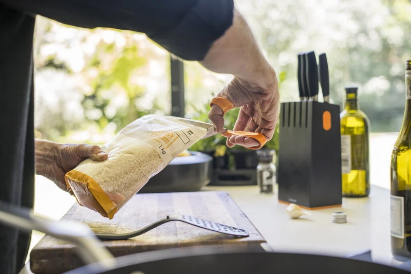 The Classic kitchen scissors can be used to cut ingredients and packages when preparing food. The blade tension is adjustable, and the serrated edges prevent objects from moving when being cut.