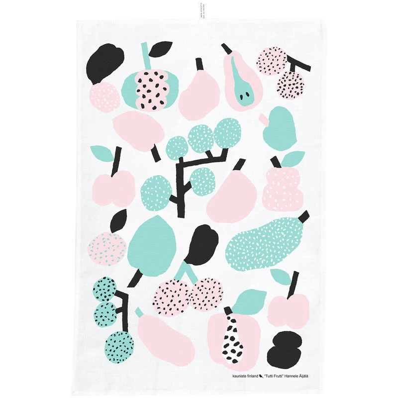 Tutti Frutti tea towel, designed by Hannele Äijälä for the Finnish Kauniste, is adorned with a delicious pattern of apples, pears, peaches and some tropical and imaginary fruits. The tea towel adds a graphic pop of colour to any kitchen. Tutti Frutti pattern has been silkscreen printed on a durable linen-cotton fabric.